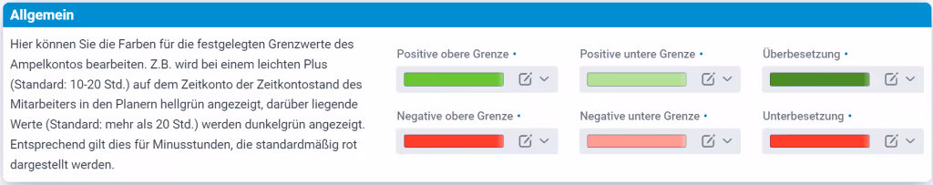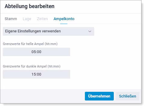 - Grenzwerte für helle Ampel festlegen: Hier geben Sie den tolerierten Wert ein, welcher vom Mitarbeiter überschritten werden darf (z.B. 5 Stunden).