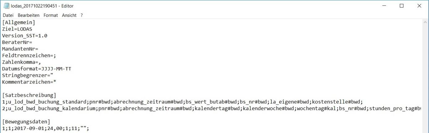 Der Bericht wird als .txt-Datei ausgegeben, die anschließend an die Lohnbuchhaltung übergeben wird. Die Textdatei kann anschließend in die Software der Lohnbuchhaltung importiert werden.
