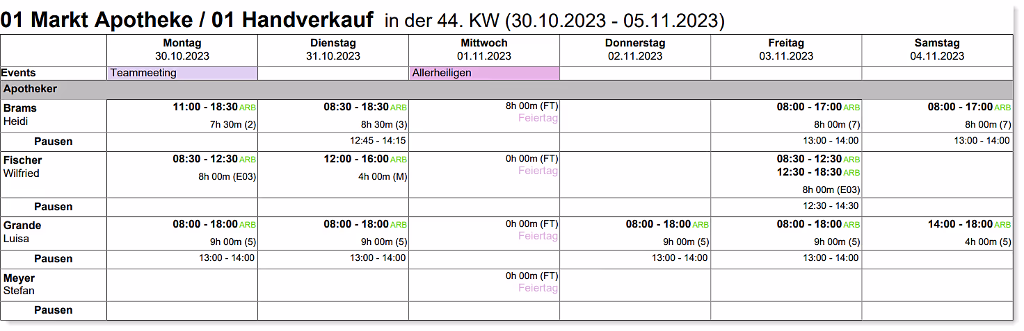 In der Ansicht des Berichts werden Ihnen die Wochenpläne angezeigt, sortiert nach Filiale/Abteilung.