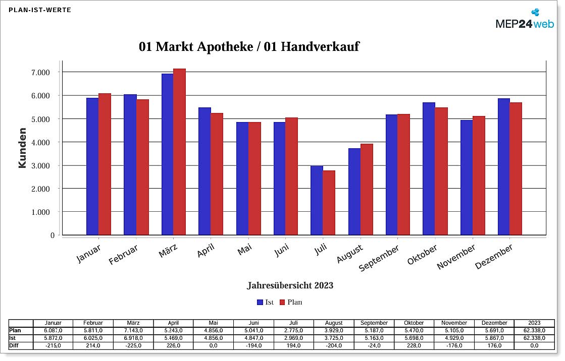 - Jahresübersicht anzeigen – Werte: Zeigt auf der letzten Seite die Gegenüberstellung von Plan- und Istwerten, bezogen auf die Kundenzahlen (Importierte Kundenzahlen) als Balkendiagramm an.