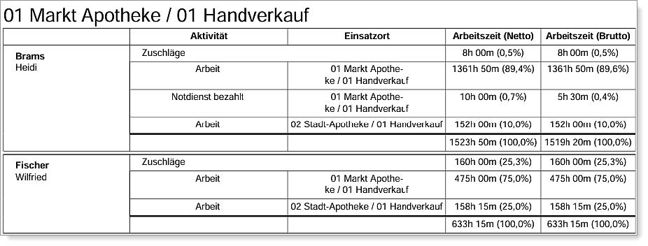 Im Anschluss werden die Stunden summiert und als Gesamtstunden ausgewiesen. Am Ende des Berichts wird noch eine Gesamtauswertung nach der Aktivität am Einsatzort aller Mitarbeiter aufgeführt und die Gesamtstunden ausgewiesen.