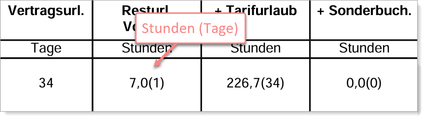 - = Gesamturlaub: Zeigt die Gesamtsumme von Resturl. Vorjahr + Tarifurlaub + Sonderbuch. an.