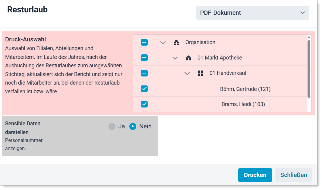 - Stichtag: Der gewählte Stichtag dient zur Ermittlung des Resturlaubs des Mitarbeiters. Sie erfahren, wie viel Urlaub der Mitarbeiter bis zu diesem Datum genommen hat und wie viel somit aktuell noch zur Verfügung steht. (Dies können Sie unter den Spalten -Url. genommen und =Urlaub aktuell in Erfahrung bringen).