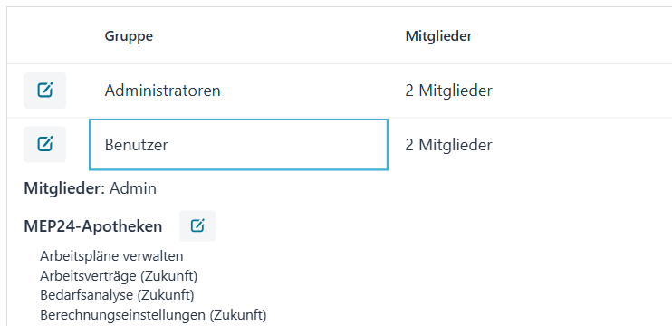 Um die Berechtigungen einer Gruppe in Erfahrung zu bringen, klicken Sie rechts auf den Namen der gewünschten Gruppe an: