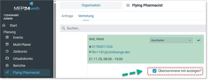 Wenn Sie unter Planung -> Flying Pharmacist -> Reiter „Vertretung“ unten rechts bei Übernommene mit anzeigen? den Haken setzen, können Sie bereits bearbeitete Anfragen weiterhin einsehen und die Sortierungsqualifikationen sowie Einsatzort nachträglich ändern.