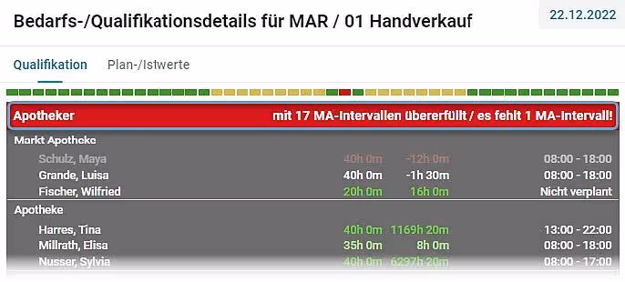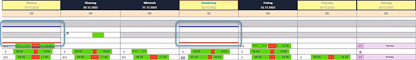 Im Planer erscheinen an dem entsprechenden Tag bzw. in der entsprechenden Stunde, zu der eine der Qualifikationen fehlt, ein roter und ein blauer Strich. Der rote Strich kennzeichnet die fehlende Qualifikation.