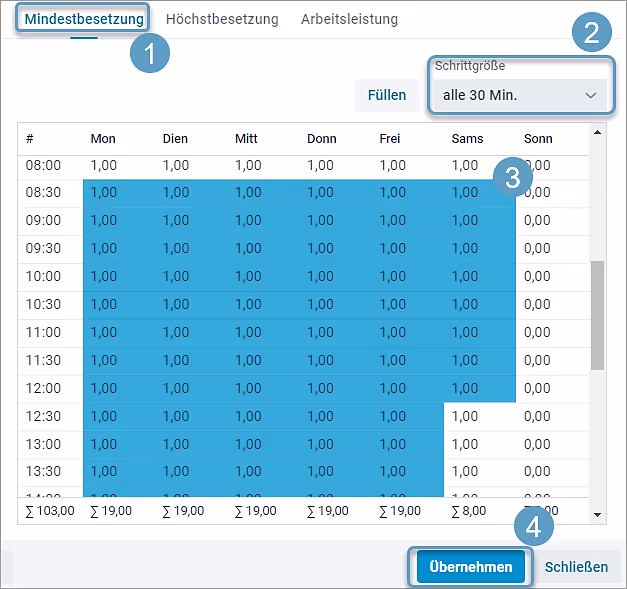 Hier geben Sie an, wie viele Mitarbeiter im angegebenen Zeitraum mindestens anwesend sein sollen.