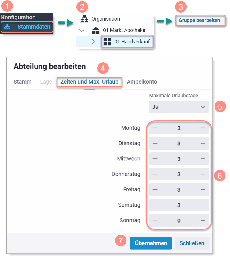 - Tragen Sie die Anzahl der Mitarbeiter ein, die in der ausgewählten Abteilung maximal in Urlaub gehen darf.