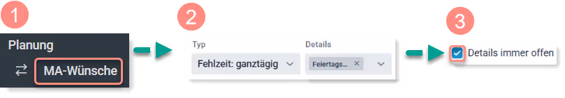 Über MA-Wünsche erscheint ein entsprechender Hinweis, wenn über „Details“ die Option „Überschreitung Urlaubstage“ gewählt ist.