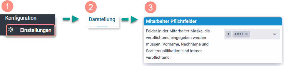 In den Einstellungen -> Reiter Darstellung gibt es jetzt die neue Auswahl „Mitarbeiter Pflichtfelder“. Hier kann individuell festgelegt werden, welche Angaben in den Stammdaten als Pflichtfeld hinterlegt und nicht umgangen werden können.