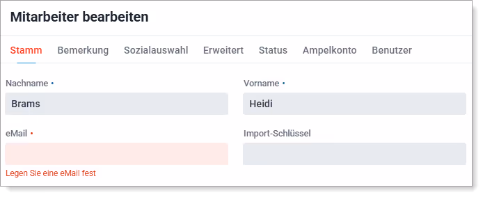 Die zuvor ausgewählten Felder, müssen nun unter Konfiguration -> Stammdaten -> Mitarbeiter bearbeiten -> Reiter: Stamm, ausgefüllt sein, damit gespeichert werden kann. Fehlt ein Eintrag, so wird das Feld rot angezeigt.