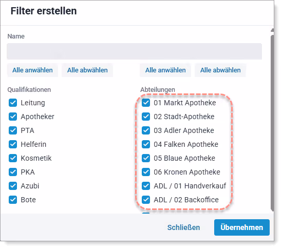 Für die Funktion „Filter“ im Multi-Planer werden Abteilungen ohne Mitarbeiter berücksichtig. Darüber hinaus können nun auch Filialen ausgewählt werden.